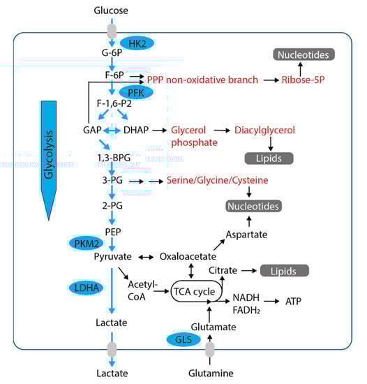 Figure 2. Biosynthetic pathways branching from glycolysis in glucose-replete conditions. Glucose is the main precursor for glycolysis (blue arrows). Glycolytic enzymes are upregulated in many cancer types, leading to enhanced generation of glycolytic intermediates. These serve as precursors for numerous metabolic pathways (marked in red) necessary for the biosynthesis of cellular biomass (highlighted in grey). Excess glycolytic intermediates are converted to pyruvate and finally lactate, which is released. The conversion of pyruvate to acetyl-CoA, leading to full oxidation in mitochondria, is relatively decreased. Additionally, amino acid catabolism, primarily glutaminolysis, is required to meet the cancer cell’s demand for nitrogen and biosynthetic precursors. PPP, pentose phosphate pathway; HK2, hexokinase 2; PFK, phosphofructokinase; PKM2, pyruvate kinase M2; LDHA, lactate dehydrogenase A; GLS, glutaminase; TCA cycle, tricarboxylic acid cycle.
