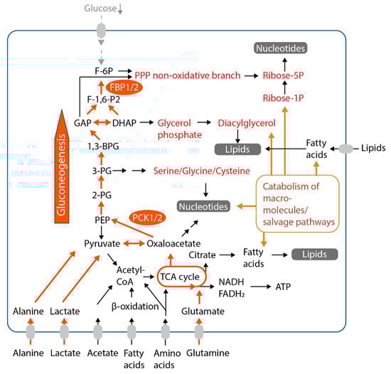 Figure 3. Gluconeogenesis and other rescue pathways for the generation of metabolic intermediates in low-glucose conditions. Precursors for biomass biosynthesis are produced from multiple alternative nutrients, like lactate or amino acids or from degradation of macromolecules (via autophagy or macropinocytosis, brown arrows/box) during a lack of glucose. Initial steps of the gluconeogenesis pathway (orange arrows), mediated by PCK1 or PCK2, are key for the generation of glycolytic intermediates under low-glucose conditions. These may serve as precursors for different metabolic pathways (marked in red) necessary for the biosynthesis of cellular biomass (highlighted in grey) also in the absence of glucose.Furthermore, the TCA cycle and enzymes of pyruvate carboxylation and degradation play an important role in the degradation or interconversion of alternative, noncarbohydrate precursors/nutrients according to the cell’s demands. TCA cycle, tricarboxylic acid cycle, Krebs cycle; PCK1/2, phosphoenolpyruvate carboxykinase cytoplasmic isoform (PCK1) or mitochondrial isoform (PCK2); FBP1/2, fructose-1,6-bisphosphatase 1; PPP, pentose phosphate pathway.