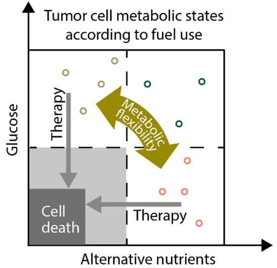 Figure 4. Targeting aberrant cancer metabolism and metabolic flexibility as an anticancer strategy. As an example of cancer cell metabolic flexibility, cancer cells (represented as circles) may switch from a state of high glucose consumption/glycolysis (brown circles) to the use of alternative nutrients (e.g., lactate; symbolized by red circles) according to the availability in the tumor microenvironment or in response to other factors. Green circles in the right upper quadrant represent cells consuming abundant glucose and “alternative” nutrients simultaneously. Treatments targeting metabolic pathways in cancer cells, like glycolysis, should take metabolic flexibility into account. Inhibition of multiple, compensatory metabolic pathways simultaneously might be necessary to reduce proliferation (light grey) or induce cell death (dark grey).