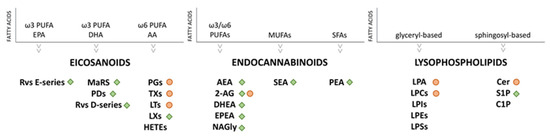 Lipids involved in inflammation. The green squares indicate lipids with anti-inflammatory properties and the orange dots indicate lipids with pro-inflammatory properties. Abbreviations. PUFAs: polyunsaturated fatty acids; MUFAs: monounsaturated fatty acids; SFAs: saturated fatty acids; EPA: eicosapentaenoic acid; DHA: docosahexaenoic acid; AA: arachidonic acid; Rvs E-series: resolvins E-series; Rvs D-series: resolvins D-series; MaRS: maresines; PDs: protectins; PGs: prostaglandins; TXs: thromboxanes; LTs: leukotrienes; LXs: Lipoxins; HETEs: hydroxyeicosatetraenoids; AEA: anandamide; 2-AG: 2-arachidonoilglycerol; DHEA: N-docosahexaenoylethanolamine; EPEA: N-eicosapentaenoylethanolamine; NAGly: N-arachidonoylglycine; SEA: stearoylethanolamide; PEA: N-palmitoylethanolamide; LPCs: lysophosphatidylcholines; LPA: lysophoshatidic acid; LPIs: lysophosphatidylinositols; LPEs: lysophosphatidylethanolamines; LPSs: lysophosphatidylserines; Cer: ceramide; S1P: sphingosine 1-phosphate; C1P: ceramide-1-phosphate.
