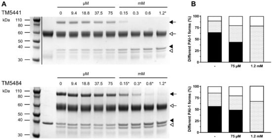 The effects of TM5441 and TM5484 on the outcome of the PAI-1/PA reaction. (A) SDS-PAGE analysis of the products of the PAI-1/tissue-type plasminogen activator (tPA) reaction in the presence of increasing concentrations of TM5441 or TM5484. Positions of SDS-stable PAI-1/PA inhibitory complex (black arrow), tPA (white arrow), unreactive/latent PAI-1 (black arrowhead), and cleaved PAI-1 (white arrowhead) are indicated to the right of the gels. The ladder in the top image was rearranged to the left side of the image. The lanes on the right side of the ladder correspond to tPA alone (upper panel) or PAI-1 alone (lower panel). For the compound concentrations indicated by an asterisk, minor precipitation was observed during the dilution of the compound; (B) conformational distribution of PAI-1 upon compound-induced inhibition in the absence (-) or presence of 75 µM and 1.2 mM of TM5441 (upper graph) or TM5484 (lower graph). Black bars represent SDS-stable PAI-1/tPA complex, dotted bars represent unreactive or latent PAI-1, and white bars represent cleaved PAI-1.