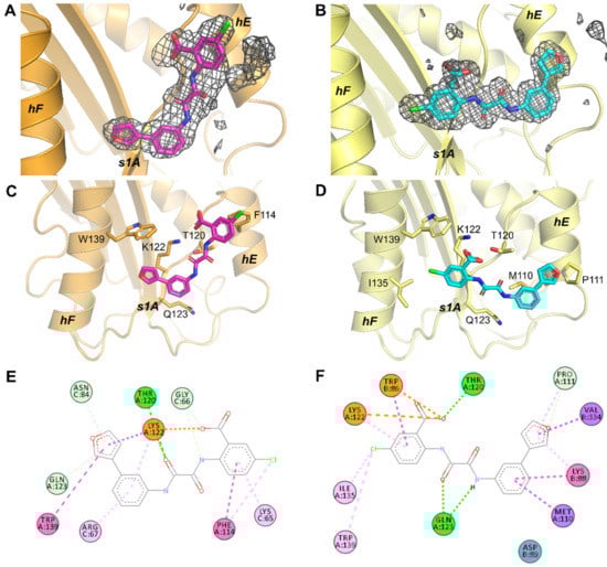 Comparison of TM5484 in the compound-bound structures shows TM5484 at the crystallographic interface between PAI-1 and Nb64 (in the PAI-1/Nb42/Nb64 crystal, Figure 4A), or between two PAI-1 molecules (in the PAI-1-stab crystal, Figure 4B). Importantly, in either case the TM5484 molecule is located at the flexible joint region in PAI-1, an area that is defined by α-helices hE, hF, and s1A (Figure 3C,D).