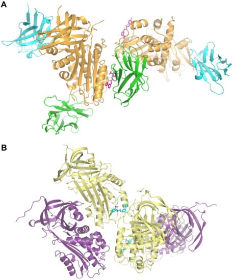 Cartoon representation of the PAI-1/TM5484 complexes. (A) In the case of the two PAI-1-W175F/Nb42/Nb64 crystals, TM5484 is located in the same orientation at the crystallographic interface between one PAI-1 molecule and an Nb64 molecule of the neighboring ASU. PAI-1 is shown in orange, Nb42 in cyan, Nb64 in green and TM5484 in magenta. (B) The ASU in the PAI-1-stab crystal comprises two PAI-1-stab molecules and one TM5484 compound associated with one of the two PAI-1 molecules. TM5484 is located at the crystallographic interface between one PAI-1 molecule of ASU 1 and one PAI-1 molecule of a neighboring ASU. PAI-1 molecules inside one ASU are shown in yellow and purple. TM5484 is shown in cyan.