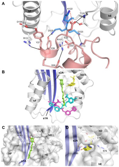 X-ray crystallographic structures of PAI-1 bound to vitronectin (Vn) and small molecule PAI-1 inhibitors. (A) Detail of the interaction between active PAI-1 and the somatomedin B (SMB) domain of Vn (pink, Protein Data Bank (PDB) ID: 1OC0 []). Hydrogen bonds are presented as black lines and salt bridges as dashed lines; (B) superimposition of the published crystal structures of PAI-1 in complex with embelin (green) and AZ3976 (yellow) with the structures of TM5484 bound to PAI-1/Nb42/Nb64 (magenta) and to PAI-1-stab (cyan); (C) cartoon representation of embelin (green) bound to a groove aligned by hD, hF, s2A and the hE-s1A loop in active PAI-1 (PDB ID: 3UT3 []); (D) cartoon representation of AZ3976 (yellow) bound to a deep pocket aligned by hD and s2A in latent PAI-1 (PDB ID: 4AQH []). PAI-1 is colored white with the central β-sheet A shown in blue.