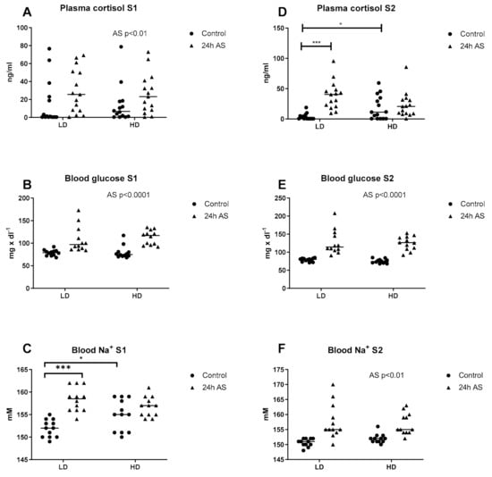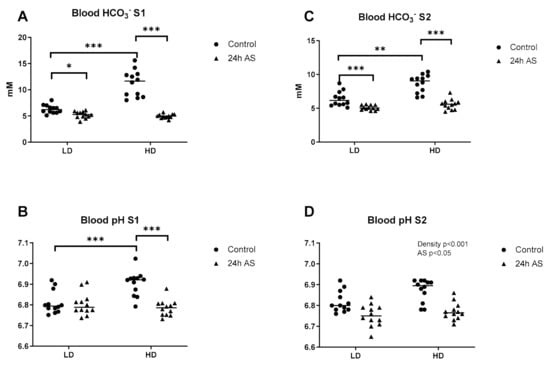 A significant interaction was observed for blood HCO3− at S1 and S2 (p < 0.0001; Figure 2A,C). The following pots hoc analyses revealed that at S1, HCO3− levels was increased in the HD group as compared to the LD group (p < 0.0001). After AS treatment there was a decrease in HCO3− levels that was more prominent in the HD group (p < 0.0001) compared to the LD group (p < 0.05). A similar pattern was observed at S2, with higher HCO3− levels in the HD compared to the LD group (p < 0.001). Whereas at this time point, AS decreased the HCO3− levels similarly in both groups (LD p < 0.0001and HD p < 0.0001).