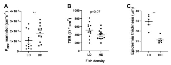 Effects of chronic stress on skin barrier function. Atlantic salmon were reared in low density (LD) and high density (HD) conditions and skin barrier function was assessed as (A) Papp for mannitol, (B) TER and (C) epidermal thickness. Statistic: Student’s t-test, ** p < 0.01. Data are presented as individual values with the line representing the mean.