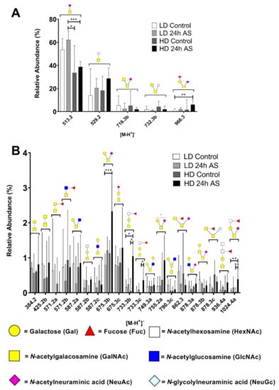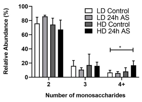Increased glycan size can be associated with decreased mucin biosynthesis rate due to longer time spent in the biosynthesis machinery in the Golgi []. Furthermore, large glycans allow the terminal structures to be more accessible to microorganisms due to additional reach. The O-glycan structures detected by LC-MS were categorized by monosaccharide length for comparison. The majority of glycans found were composed of two monosaccharides and mainly constituted by sialyl-Tn, but structures comprised of up to eight monosaccharides were detected. The largest abundance of long and complex O-glycans (more than 4 monosaccharides) was present among the HD-AS group (p < 0.05, Figure 6).