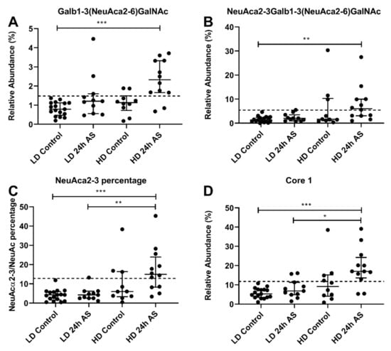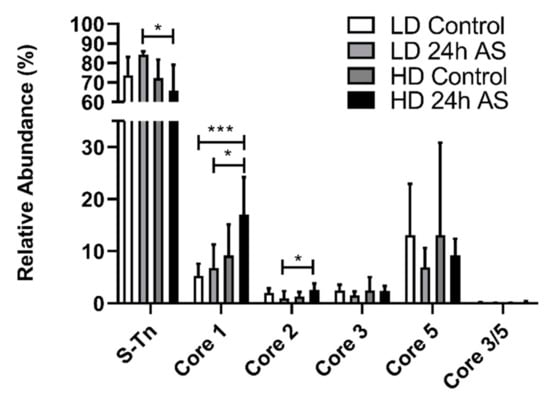 The type of core structures synthesized is a determining factor in what structures the available glycotransferases are able to synthesize. The core structures found are dependent on tissue type and expression can change due to, e.g., infection and inflammation []. In total, four O-glycan core structures were detected in the skin mucins: core 1, 2, 3, and 5. Of these, core 1 and 5 were most abundant (median 7 and 10% relative abundance, respectively). Although the abundant Sialyl-Tn structures (NeuAcα2-6GalNAcol, NeuGcα2-6GalNAcol and Kdnα2-6GalNAcol: median 76% relative abundance) are strictly not core structures, they were included in this calculation. The relative abundance of core 1 structures was significantly increased in the HD-AS cohort compared to the LD control and LD-AS fish (Figure 5). The single stressed (acute: LD v/s LD-AS and chronic: LD v/s HD) groups also displayed a modest trend towards an increase in core 1 structures.