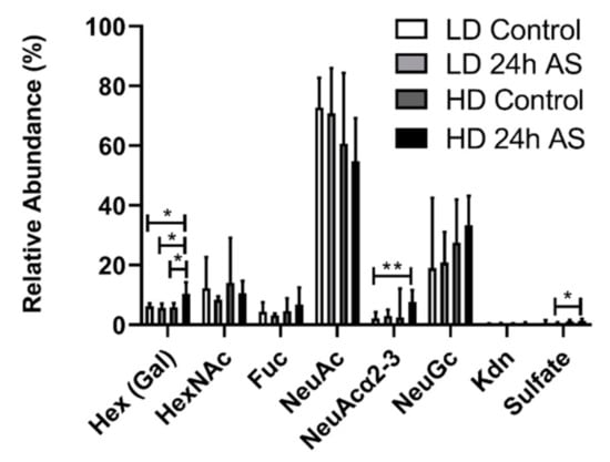 The terminal moieties of the O-glycans are the main interaction target for pathogens in mucins and are used as a decoy to prevent direct adhesion to the epithelial cells, but can also be used by the pathogens as a nutrient source and to colonize the mucus layer [,]. Significantly more Hexoses and α2-3 linked NeuAc were found in the HD-AS cohorts, while a trend towards a higher ratio of NeuGc/NeuAc was observed for the HD fish (Figure 7). The hexoses are most likely mainly composed of galactose, based on similar MS/MS spectra and retention times to previously identified O-glycan structures. The level of sulfation on the glycans was overall very low, but increased in response to stress (Figure 7). The largest difference was in NeuAcα2-3, where the median relative abundance in the HD-AS cohort was more than 3 times higher than the median value of the LD cohort (p < 0.01, Figure 7).
