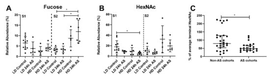 Stress-induced glycosylation changes that differed between sampling time points. Atlantic salmon were grown under low density (LD) and high density (HD) conditions with and without being subjected to an acute stress (AS) protocol and glycans analyzed by LC-MS. The first sampling time point (S1) was 73 days after the Atlantic salmon had been transferred to sea water and the second time point (S2) was 128 days after transfer. (A) Relative abundance of fucosylated structures and (B) Relative abundance of terminal HexNAc structures. (C) Effect of exposure to the acute stress protocol (AS) on HexNAc. To highlight the effect of the AS protocol regardless of fish density and time point, data were normalized to the median of the respective control groups (from panel (B)). Statistics: * p < 0.05, A and B: Kruskal–Wallis test with Dunn’s post hoc test and C: Mann–Whitney U-test. Data are presented as median and interquartile range.