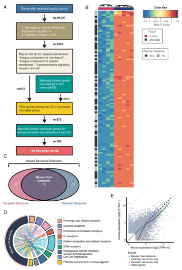 Identification of microglial mouse sensome shows major overlap between two independent datasets. (A) Flow chart showing selection of genes from the Gosselin et al. mouse datasets to identify the n = 576 candidate sensome genes. First, technical quality control was performed and genes with a low number of reads per sample were excluded. Second, differential expression analysis with a cut-off of log2fold >2 and p-adjusted value <0.05 was used to select genes significantly expressed by microglia. Third, using gene ontology (GO) annotation, we selected genes with association to “plasma membrane”, “integral component of membrane”, “integral component of plasma membrane”, and “transmembrane signaling receptor activity” (genes not mapped were manually curated). Fourth, the top 25% expressed genes were selected as candidate sensome genes. Finally, from the candidate sensome genes, the top 100 were manually verified using the criteria that these should express genes that translate in proteins that are present in the cell membrane and have a receptor-like function. In summary, these genes are highly expressed and specific to microglia and their respective proteins are located in the plasma membrane, where it has a receptor-like function. (B) Heatmap showing the first 100 sensome candidate genes (left to right) ordered by differential expression between cortex and microglia (low to high), with the upper row showing if the gene is present in “Hickman et al.”. (Supplementary Table S2). (C) Venn diagram showing the overlap between the top 100 Gosselin and Hickman mouse sensome genes (Supplementary Table S2). This total set is termed the “mouse sensome extended” and the shared set is called the “mouse core sensome”. (D) Circ plot showing the components of the 73 mouse overlapping sensome genes including the distribution of genes over the assigned subgroups. The genes are ordered based on log2fold differential expression (DE) extracted from the Gosselin dataset (microglia to cortex). (E) Scatterplot displaying the genes of the extended and overlapping mouse sensome, illustrating a minor enrichment of genes that are higher expressed in mice compared with humans. ECM, extracellular matrix.