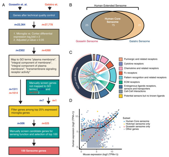 Identification of microglial human sensome. (A) Flow chart showing the selection of candidate genes using the Gosselin et al. human and Galatro et al. human microglial RNAseq datasets. A similar approach as in the mouse sensome selection was applied to finally select genes with translated proteins located in the cell membrane and that have a receptor function that are highly and specifically expressed by microglia. (B) Overlap between the Gosselin and Galatro mouse sensomes displayed in a Venn diagram, showing majority of genes from dataset overlap as candidate sensome genes. The total set is termed the “human sensome extended” and the shared set is called the “human core sensome” (Supplementary Table S3). (C) Human overlapping genes and assigned subgroups shown using Circ plot. (D) Distribution of human sensome genes showing a more evenly distributed over preferentially human and mouse expressed genes.