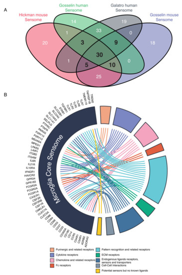 Overlap between mouse and human sensome reveals microglia core sensome. (A) Overlap between human and mouse sensome genes. We defined the microglia core sensome as genes present in three out of four sensome datasets (in bold). (B) Circ plot illustrating the functional subgroups of the microglia core sensome genes as identified by the shared expressed sensing genes in human and mouse microglia.
