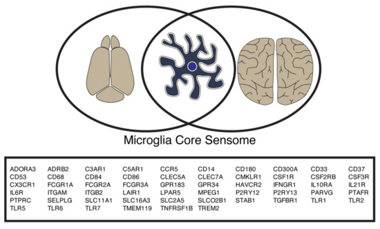 One of the main functions of microglia is to survey the environment to sense potential pathological conditions. In mice, the 100 most highly expressed genes responsible for sensing have previously been identified. This set of genes is termed the “sensome” and was first described by Hickman et al. [7,8]. These 100 genes include purinergic receptors, cytokine receptors, chemokines, Fc receptors, pattern recognition receptors, extracellular matrix (ECM) receptors, endogenous ligands receptors, sensors, transporters, and proteins involved in cell–cell interactions. The expression of the murine sensome genes decreases during aging and has recently also been reported to be downregulated in the presence of a glioma [3]. In addition, downregulation of the sensome genes is observed directly after traumatic brain injury (TBI), with expression being restored to baseline over time [9]. This indicates that aged microglia and microglia in the presence of a neoplasm, or after TBI, have a decreased capacity to sense their environment, possibly leading to reduced host defense response. Here, we have analyzed and discussed a number of microglia bulk and single cell RNAseq datasets from mouse and human disease models and found a number of sensome genes downregulated over time or over the course of disease [4,10,11,12,13]. The decrease in sensome expression could result in accelerated neurodegeneration of the brain or in the case of an existing neoplasm in enhanced tumor progression [3,7,9].