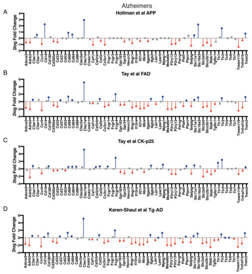 Microglia core sensome expression in Alzheimer’s disease (AD). (A) Two-log fold change of microglia core sensome genes in microglia in AD mouse model (APP) [12]. (B) Microglia core sensome gene expression in 5xFAD mouse model [13]. (C) CK-p25 mouse model gene expression of microglia showing changes in microglia core sensome [13]. (D) Differential gene expression analysis of single cell microglia data comparing homeostatic microglia versus disease-associated microglia (DAM) in an AD mouse model (Tg-AD) showing changes in microglia core sensome [4]. Red bars display gene significantly upregulated, blue bars represent gene significantly downregulated (detailed expression data in Supplementary Table S5).