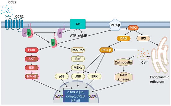CCL2 signaling. As response to CCL2 binding at the N-terminus, extracellular loops and transmembrane bundle of CCR2, the intracellular G-protein αi subunit dissociates from the CCR2 and the βγ subunit. The α subunit then inhibits adenylyl cyclase (AC) function resulting in decreased cyclic adenosine monophosphate levels. In contrast, the βγ subunit signaling induces gene expression via several pathways. PI3K, phosphoinositide 3-kinase; AKT, protein kinase B; IKK, inhibitor of NF-κB kinase; NF-κB, nuclear factor of kappa-light-chain-enhancer of activated B cells; Ras, rat sarcoma; Rac, ras-related C3 botulinum toxin substrate; Raf, rapidly accelerated fibrosarcoma; MEK, mitogen-activated protein kinase; p38, mitogen-activated protein kinase; JNK, c-jun N-terminal kinase; ERK, extracellular signal-regulated kinase; PLC-β, phospholipase C-β; PIP2, phosphatidylinositol 4,5-bisphosphate; DAG, diacylglycerol; IP3, inositol 1,4,5-triphosphate; PKC-β, protein kinase C-β; CAM, Ca2+/calmodulin-dependent protein kinase; c-fos, proto-oncogene c-Fos; c-jun, proto-oncogene Jun; c-myc, proto-oncogene Myc; CREB, cAMP response element-binding protein. Modified from Bose S. & Cho J. [75] using BioRender.com.