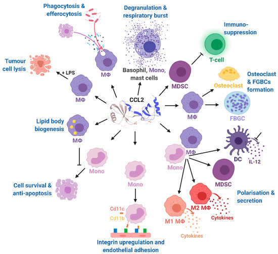 Effects of CCL2 on different immune cell types. Mono, monocytes; MΦ, macrophages; DC, dendritic cells; FBGCs, foreign body giant cells; MDSC, myeloid-derived suppressor cell; IL-12, interleukin 12; LPS, lipopolysaccharide; CD11b, cluster of differentiation molecule 11B; CD11c, cluster of differentiation molecule 11C. The CCL2 structure was taken from uniprot [86]. Modified from Gschwandtner M. et al. [60] using BioRender.com.