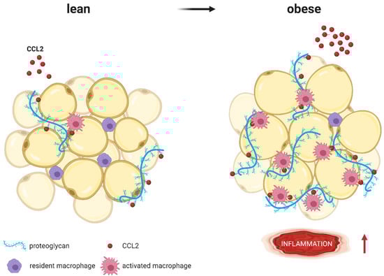 CCL2 (red molecules) binds to proteoglycans (blue strands) such as heparan sulfate or heparin, which are part of the extracellular matrix surrounding adipocytes. Whereas lean AT expresses low proteoglycan levels, expression increases with obesity. As coreceptors, proteoglycans immobilize CCL2 and present it to macrophages, resulting in higher AT inflammation (represented by ↑). Modified from Pessentheiner A. et al. [140] using BioRender.com.
