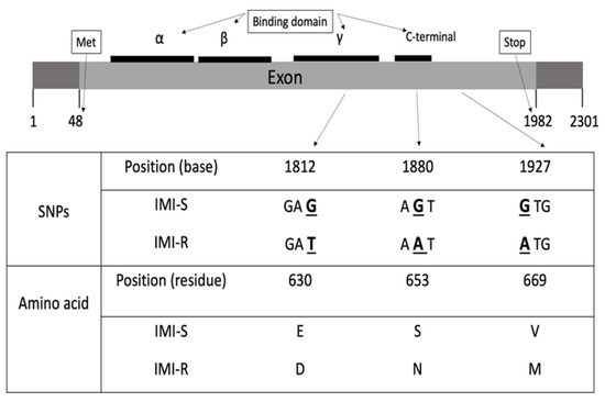 In order to validate whether the 43 SNPs would result in amino acid changes that would affect the functions of the ALS enzyme, functional mutation analysis was performed. All rice ALS amino acid sequences were inferred from nucleotide sequences by EMBOSS Transeq (https://www.ebi.ac.uk/Tools/st/emboss_transeq/) and aligned with published Arabidopsis amino acid sequence (GenBank ID NM114714) by ClustalW (https://www.ebi.ac.uk/Tools/msa/clustalo/) (Supplementary Figure S1a–c). The 43 exon-derived SNPs are mainly caused by intraspecific variation [16], except for three SNPs located at Positions 1812, 1880, and 1927 (Figure 1). These point mutations resulted in amino acid substitutions from glutamic acid to aspartic acid (Glu630Asp), serine to asparagine (Ser653Asn), and valine to methionine (Val669Met), respectively. These three amino acid alterations were consistent in all IMI-R individuals except for the 12 IMI-Ra rice, which showed no mutation in the ALS-coding region.