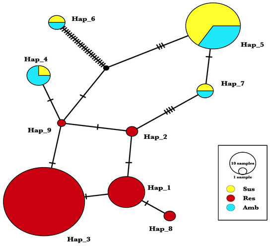 Haplotype analysis of the ALS gene. All weedy rice samples are grouped into nine haplotype groups. Sus: IMI-susceptible weedy rice; Res: IMI-resistant weedy rice; Amb: IMI-R ambiguous weedy rice.
