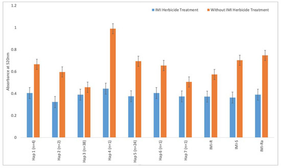 From the results shown in Figure 3, the absorbance readings of each weedy rice sample were tabulated based on their haplotype grouping in order to compare the functionality of the ALS enzyme. Under the condition without IMI herbicide treatment, Hap_1, Hap_2, and Hap_3, consisting of IMI-R weedy rice, showed a significantly lower absorbance reading (p < 0.001, Student’s t-test) compared to IMI-S samples (carrying genotypes of Hap_4, Hap_5, Hap_6, and Hap_7). The average absorbance readings for these groups of IMI-R weedy rice with and without IMI herbicide treatment are 0.3726 and 0.5729, respectively, whereas the average readings for Hap_4, Hap_5, Hap_6, and Hap_7 are 0.3978 and 0.7968 with and without IMI herbicide treatments. There is no significant difference observed between IMI-R and IMI-S groups treated with the IMI herbicide (p > 0.05, Student’s t-test; Figure 3). This is in line with the weak positive correlation (r = 0.062, p < 0.05) between the ALS enzyme activity and the three nonsynonymous mutations. Two additional Spearman correlation tests on individual SNP at the position 1880 and all 43 SNPs within the ALS gene showed a weak negative correlation, with the r coefficients being −0.095 and −0.083, respectively (p < 0.05). Together with the fact that resistant IMI-Ra samples carry the “G” allele, we hypothesized that ALS enzyme activity under IMI herbicide treatment might be influenced by genetic factors other than the ALS gene.