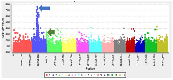 Manhattan plot showing a peak on chromosome 2 (blue arrow) (with –log10 (p-value) > 5.8) where the ALS gene is located. A lower peak on chromosome 3 (green arrow) was identified as a potential gene contributing toward IMI resistance in weedy rice.