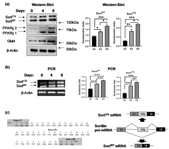Sortilin alternatively spliced variants’ expression during adipogenesis. 3T3L1 preadipocytes were differentiated and harvested at days 0 (pre-adipocytes), day 4 (terminally differentiated adipocytes), and day 8 (mature adipocytes). (a) Western blot analysis was performed on lysates harvested on days 0, 4 and 8 and probed using antibodies against sortilin, peroxisome proliferator activated receptor ɣ (PPARγ), glucose transporter-4 (Glut4) or β-actin as indicated in the figure. Graphs show densitometric analysis of individual bands for each protein that are normalized to β-actin (n = 5). Statistical analysis was performed by one-way ANOVA; * p < 0.05, ** p < 0.01, and *** p < 0.001 between day 0 and day 4 samples or day 0 and day 8 samples. (b) RNA was isolated on days 0, 4 and 8, followed by PCR analysis using primers specific to sortilin exon 17 (sense) to exon 19 (anti-sense). The PCR products were separated on a 1% agarose gel and visualized using ethidium bromide staining. Graphs show densitometric analysis of individual PCR products normalized to β-actin (n = 5). Statistical analysis was performed by one-way ANOVA; ** p < 0.01, and *** p < 0.001 between days 0, 4, and 8 samples for wildtype (SortWT) and sortilin variant with included exon 17b (Sort17b) variants. (c) The two PCR products obtained using primers to sortilin exon 17 (sense) to exon 19 (anti-sense) were purified and sequenced. Sequencing results revealed inclusion of a 99 bp sequence, named exon 17b, between exons 17 and 18 of sortilin mRNA. The schematic depicts sortilin pre-mRNA alternative splicing generating SortWT mRNA (exclusion of exon 17b) and Sort17b mRNA (inclusion of exon 17b).