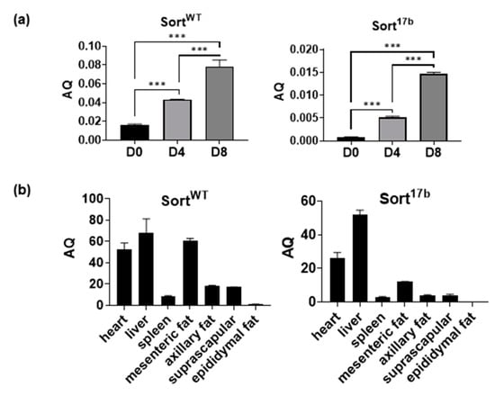 Endogenous expression levels of murine sortilin variants. (a) Total RNA was isolated from differentiating 3T3L1 cells harvested at days 0, 4, and 8. Real-time SYBR Green qPCR was performed using primers specifically targeting the 17/18 exon junction (to detect SortWT) or within exon 17b (to detect Sort17b). A standard curve for each sortilin variant was included with the qPCR assay along with samples run in triplicate. Absolute quantification (AQ, ng) for SortWT and Sort17b was calculated by normalizing the values to β-actin (n = 5). Statistical analysis was performed by one-way ANOVA; *** p < 0.001 between day 0, 4 and 8 samples for SortWT and Sort17b variants. (b) Organs and specific adipose depots were harvested from C57BL6 mice and homogenized in a bead homogenizer. RNA was isolated and real-time SYBR Green qPCR was performed using primers specifically targeting the 17/18 exon junction (to detect SortWT) or within exon 17b (to detect Sort17b). Absolute quantification (AQ, ng) for SortWT and Sort17b was calculated by normalizing the values to β-actin (n = 4).