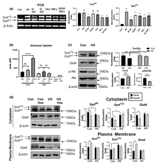 To evaluate if sortilin alternatively spliced variants relate to impaired glucose uptake and insulin resistance as seen in the pathology of T2DM, 3T3L1 adipocytes were rendered insulin resistant using several previously established methods. 3T3L1 preadipocytes on day 0 have low levels of Sort17b which increase with differentiation. To enable detection of both sortilin variants’ levels in response to methods rendering them insulin resistant, 3T3L1 pre-adipocytes (day 0) were differentiated (as described in methods) for 2 days. In separate wells, along with the differentiation cocktail, several methods to induce insulin resistance were undertaken including: 10% high serum (HS), 100 nM and 200 nM hyperinsulinemia (HI100, HI200), 1 μM dexamethasone (Dex), 2.5 nM TNFα, and a combination of hyperinsulinemia and TNFα. After 48 h, RNA was isolated followed by PCR analysis using primers for exon 17 (sense) and exon 19 (antisense) which detects SortWT and Sort17b expression simultaneously. Results (Figure 3a) demonstrate that all methods of insulin resistance promoted an increase in inclusion of sortilin exon 17b, whereas the high serum method consistently and reproducibly increased expression of Sort17b. The high serum method was previously used to induce insulin resistance in adipocytes [,]. Hence, we next verified that the high serum method mimicked the physiological response of insulin resistance by performing a glucose uptake assay. 3T3L1 pre-adipocytes were differentiated and on day 4, high (10%) serum was added for 48 h. Glucose uptake assay was then performed using Promega’s Glo glucose uptake assay kit. Stimulation with 100 nM insulin induced a dramatic increase in glucose uptake in control adipocytes, but glucose uptake was significantly impaired in high serum treated cells (Figure 3b), indicating that this method induced insulin resistance in 3T3L1 adipocytes.