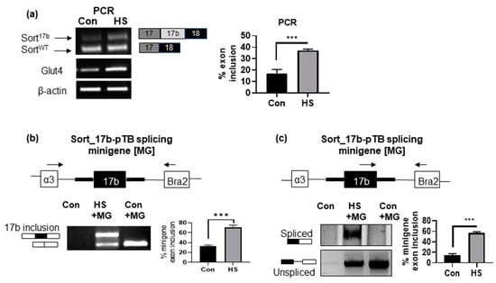 High serum (HS) method of insulin resistance promotes inclusion of sortilin exon 17b. (a) 3T3L1 cells were differentiated and on day 4, insulin resistance was induced by high serum for 48 h. Total RNA was isolated, PCR was performed using primers specific to sortilin exon 17 (sense) to exon 19 (anti-sense) to simultaneously detect both sortilin variants. The PCR products were separated on a 1% agarose gel, visualized using ethidium bromide staining and normalized to β-actin expression. (n = 5). Graph represents endogenous percent inclusion of exon 17b, which was calculated using the Equation (1). Statistical analysis was performed by two tailed t-test; *** p < 0.001 between control and high serum (HS) samples. (b) Sort_17b-pTB splicing minigene (MG) was transfected into 3T3L1 adipocytes and treated with high serum for 48 h. The control samples had no minigene transfection. Total RNA was isolated, PCR was performed using primers on splice donor exon (α3, sense) to splice acceptor exon (Bra2, antisense) of the Sort_17b-pTB splicing minigene. The PCR products were separated on a 1% agarose gel and visualized using ethidium bromide staining (n = 5). Graph represents percent exon 17b inclusion within Sort_17b-pTB splicing minigene (MG) in control vs. high serum, which was calculated using the Equation (2). Statistical analysis was performed by two tailed t-test; *** p < 0.001 between control and high serum (HS) samples. (c) PCR was performed using primer specific for sortilin exon 17b (sense) and splice acceptor exon (Bra2, antisense). The PCR products were separated on PAGE and visualized using silver staining (n = 5). Graph represents percent exon 17b inclusion within Sort_17b-pTB splicing minigene (MG) in control vs. high serum, which was calculated using the Equation (2). Statistical analysis was performed by two tailed t-test; *** p < 0.001 between control and high serum (HS) samples.