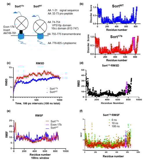 Since there are no full-length structures of sortilin from cryo-EM in its native membrane bound state, we used molecular modeling to visualize both sortilin variants. Mouse SortWT extracellular domain was determined by X-Ray crystallography (Protein Database (PDB) ID: 5NMR); however, the structures of the transmembrane and cytoplasmic tail domains have not been determined. Using amino acid sequences of both sortilin variants, we obtained structural predictions from the protein server iTASSER [,,], an online server for determining lowest energy folding compositions for de novo protein predictions utilizing available structural information of similar homologues of a given protein or portions of proteins. Sortilin structural prediction results were aligned with the X-Ray crystallography generated PDB structure of the sortilin VPS10p domain. Then, proteins were equilibrated for 100 ns using molecular dynamics (MD) run with NAMD 2.12 [] using the CHARMM36m force field []. MD simulations were run to observe protein structural changes in sortilin including backbone flexibility (using root mean square deviation (RMSD)) [,] and molecular motions (using root mean square fluctuation (RMSF)). During equilibration, RMSD was plotted over a 100 ns time trajectory (Figure 5c). Sort17b showed significantly higher RMSD than SortWT over the first 75 ns of the simulation, suggesting increased backbone flexibility. To further probe which residues may contribute to increased flexibility, RMSD was plotted per residue for Sort17b (Figure 5d), indicating movement within exon 17b and the C-terminal domain of sortilin.