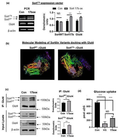 Sortilin is a central component of GSV and is pivotal in translocation of glucose transporter-4 (Glut-4) to facilitate glucose uptake. Since high serum-induced insulin resistance resulted in decreased glucose uptake and increase in expression of Sort17b splice variant, we sought to evaluate the interaction of sortilin splice variants with Glut4 in 3T3L1 adipocytes. Sort17b expression vector (gifted by Dr. Leonard Petrucelli []) was transfected into 3T3L1 adipocytes for 48 h. Over-expression of the Sort17b was verified through PCR analysis (Figure 6a). Interestingly, Sort17b over-expression increased Glut4 expression levels, similar to the increase seen under high serum conditions.