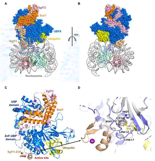 - Köhler, A.; Zimmerman, E.; Schneider, M.; Hurt, E.; Zheng, N. Structural basis for assembly and activation of the heterotetrameric SAGA histone H2B deubiquitinase module. Cell 2010, 141, 606–617. [Google Scholar] [CrossRef] [PubMed]