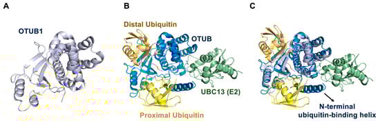 - Juang, Y.-C.; Landry, M.-C.; Sanches, M.; Vittal, V.; Leung, C.C.Y.; Ceccarelli, D.F.; Mateo, A.-R.F.; Pruneda, J.N.; Mao, D.Y.L.; Szilard, R.K.; et al. OTUB1 co-opts Lys48-linked ubiquitin recognition to suppress E2 enzyme function. Mol. Cell 2012, 45, 384–397. [Google Scholar] [CrossRef]