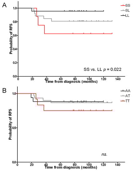 To investigate the long-term clinical impact of certain polymorphisms, we evaluated the trend of standardized log-rank statistics using relapse-free survival (RFS) time. Among patients with the SS genotype, 3 patients (37.5%) experienced relapse at mean time of 30 months from the diagnosis. Among patients with the SL genotype, five patients (18.5%) experienced relapse at mean time of 30.4 months from the diagnosis. Among patients with the LL genotype, one patient (4.8%) experienced relapse at 19 months from the diagnosis. The proportion of patients who experienced relapse within certain subgroup (SS, SL or LL) did not reach statistical significance (p = 0.08). The five-year actuarial probabilities of RFS were 62.5%, 80.8%, and 95.5% for SS, SL, and LL group respectively, with the highest difference between SS vs. LL genotype (p = 0.022) (Figure 1A). This analysis suggests that the presence of short alleles might be a risk factor for poor prognosis. However, the effect of length polymorphism on patients’ overall survival (OS) did not reach statistical significance.