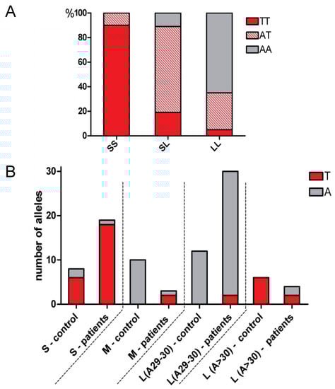 Co-segregation of the A and T alleles with HMOX1 promoter length variants: (A) Shown as a percentage frequency distribution of AA, AT and TT genotype in SS, SL and LL individuals (both patients and control group); (B) distribution of AA and TT in individuals with certain length variants, separately in the patient and control group; S—short alleles (GT n < 24), M—medium alleles (24–28 GT n), L—long alleles (29/30 GT n), L—very long alleles (GT n > 30).