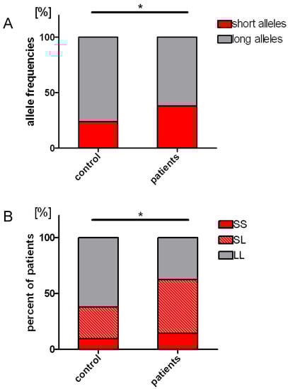 (A) Frequencies of short and long alleles in the patient and control groups. In ALL patients: 43 short alleles (38.4%) and 69 long alleles (61.6%); in control group: 20 short alleles (23.8%) and 64 long alleles (76.2%). (B) Comparison of percentage of patients and healthy controls with the SS, SL or LL genotype. In ALL patients: SS genotype—8 patients (14.3%), SL genotype—27 patients (48.2%), LL genotype—21 patients (37.5%). In controls group: SS genotype—4 individuals (9.5%), SL genotype—12 individuals (28.6%), LL genotype—26 individuals (61.9%). *—p < 0.05.