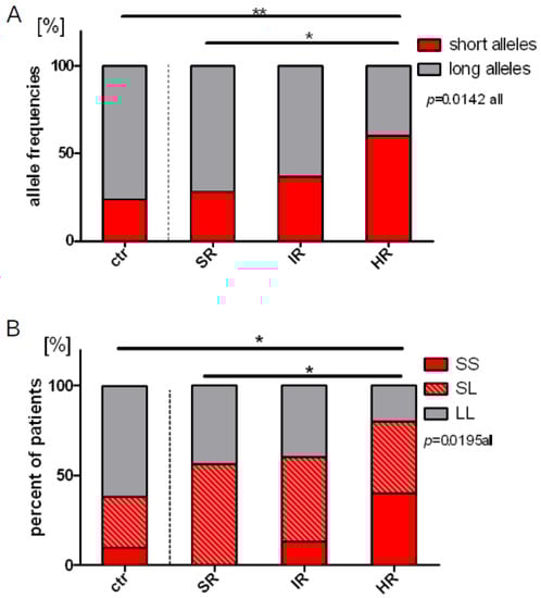 (A) Frequencies of short and long alleles in the control group and in patients stratified into the risk groups. In the control group: 20 short alleles (23.8%) and 64 long alleles (76.2%); in the SR group: 9 short alleles (28.1%) and 23 long alleles (71.9%); in the IR group: 22 short alleles (36.7%) and 38 long alleles (63.3%); in the HR group: 12 short alleles (60%) and 8 long alleles (40%); (B) Comparison of percentage of individuals with the SS, SL and LL genotypes in the control group and in patients stratified into the particular risk groups. In the control group: SS genotype—4 individuals (9.5%), SL genotype—12 individuals (28.6%), LL genotype—26 individuals (61.9%). In the SR group: SS genotype—0 patients, SL genotype—9 patients (56.2%), LL genotype—7 patients (43.8%). In the IR group: SS genotype—4 patients (13.3%), SL genotype—14 patients (46.7%), LL genotype—12 patients (40%). In the HR group: SS genotype—4 patients (40%), SL genotype—4 patients (40%), LL genotype—2 patients (20%). *—p < 0.05; **—p < 0.01.