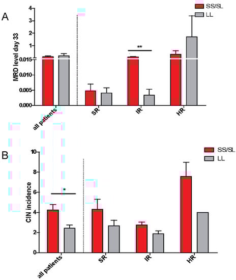 (A) MRD level at 33rd day of treatment in association with the presence of short alleles in patients, shown in all patients and separately in patients stratified into the particular risk groups. Mean MRD was 0.086 ± 0.17 in patients with at least one S allele versus mean MRD 0.0033 ± 0.006 in the LL patients. In the SR group—data available for 15 patients, in the IR group for 28 patients, in the HR group for 10 patients. (B) CIN incidences in association with the presence of short alleles in patients, shown in all patients, and separately in patients stratified into the particular risk groups. Then the influence of genotype and a risk group was calculated as independent variables on a number of CIN incidents. It appeared that the main effect resulted from the risk group (two-way ANOVA, p = 0.0005), but there was also an effect of genotype (p = 0.0055). In the SR group—data available for 15 patients, in the IR group for 24 patients, in the HR group for 10 patients. Data are presented as means and SEM * p < 0.05, ** p < 0.01.