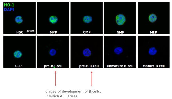 Interestingly, we found that in hematopoietic stem cells and in progenitors committed to granulocyte or megakaryocyte lineage HO-1 is mainly located in the nucleus, what may indicate its non-canonical, non-enzymatic role []. However, upon maturation into preB-I stage of B-cell development (the stage of normal B-cell development, which is most prone to malignant transformation into BCP-ALL (the pre-pro-B to pre-BI transition) [], HO-1 expression was barely detectable (Figure 6). This was consistent with the fact that BACH2—HO-1 suppressor—is upregulated at the transition from multipotent progenitor (MPP) into the B cell lineage, before the completion of the heavy chain checkpoint []. These data suggest that in physiological conditions HO-1 expression is not required for the maturation of B-cell precursors.