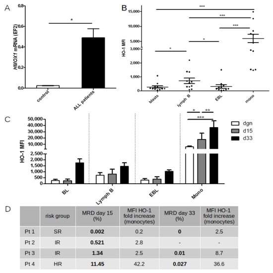 At the day of diagnosis we compared the HO-1 MFI between leukemic cells and the residual normal cell subsets present in the sample (Figure 7B). We found that HO-1 expression was the lowest in leukemic blasts, with comparable level of expression as in erythroblasts. The expression of HO-1 in mature B-cells was slightly higher than in the blast cells (p = 0.004), and erythroblasts (p = 0.048). The highest HO-1 expression was detected in monocytes when compared to all analyzed subsets (monocytes in comparison: to blast cells—p < 0.0001, to mature lymphocytes B—p = 0.0002, and to erythroblasts—p = 0.0001). This pattern of HO-1 expression in non-malignant cells was similar to pattern of Hmox1 mRNA expression described in murine hematopoiesis model []. As HO-1 is a stress inducible enzyme, we have investigated whether HO-1 expression is indeed elevated in patients during induction chemotherapy, as at this point the regimen intensity is the same, regardless of the risk group. This analysis was done in six patients at day 15th and only three patients at day 33rd, as in the remaining three patients there was an insufficient amount of sample (due to aplastic bone marrow) to perform additional stainings, apart from routine MRD measurement. Only in monocytes was the HO-1 level statistically higher during following induction cycles (two-way Anova with Bonferroni posttests, Figure 7C), we performed further analysis tracking relative changes of HO-1 level in individual patients with distinct early treatment response (Figure 7D). We found that the higher the fold increase of HO-1 in monocytes was observed, the higher level of MRD detected. Based on both HO-1 level directly measured in monocytes at days 15th and 33rd as well as relative HO-1 level changes in individual patients with different early treatment response (expressed as MRD level), we postulate that the altered HO-1 expression in bone marrow monocytes—but not in lymphocytes—may represent a response to stressful conditions, rather reflecting modulation of HO-1 in the tumor microenvironment as a potential mechanism of chemotherapy resistance.