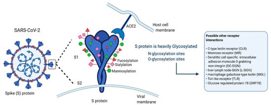 SARS-CoV-2 is a lipid-enveloped positive-sense RNA virus [,], which uses a heavily glycosylated spike (S) protein to facilitate its attachment, membrane fusion, and entry into host cells [,,]. The S protein is a class I fusion polypeptide chain consisting of 1273 amino acids, which associates as a homotrimer [,]. The individual monomers are composed of two subunits, subunit 1 (S1) and subunit 2 (S2), which contain three distinctive topological domains: (i) Head, (ii) central stalk, and (iii) cytoplasmic tail []. The S1 contains an N-terminal domain and the receptor-binding domain, which houses the receptor-binding motif [,]. The receptor-binding motif has been shown to interact with ACE2, permitting entry and infection of host cells [,,]. The S2 contains a central helix, connecting domain and a fusion protein, which facilitates union between viral and host cell membranes []. Located between S1 and S2 is a unique furin cleavage site, postulated to be cleaved by transmembrane serine protease 2 [,,] for S protein priming, which is necessary for infection [,]. An additional proteolytic cleavage site located in the S2 is utilized for release of the fusion peptide, allowing for host cell penetration and fusion []. As shown by previous literature, protein glycosylation is crucial for viral infection [,]. SARS-CoV-2 S protein is extensively glycosylated [,,,], sharing approximately 67% of sequence homology [] and 18 N-glycosylated sites with SARS-CoV []. Mapping of SARS-CoV-2 S protein has led to the discovery of 2 predicted O-glycosylation sites [] and 22 predicted N-glycosylation predicted sites per promoter [,]. N-glycan moieties, present on the S protein, are responsible for receptor binding domain conformational changes necessary for association with ACE2 [,,]. However, studies have reported viral susceptibility in intra- and extrapulmonary immune and non-immune cells with ACE2 deficiency [,,] or absence [], suggesting that the S protein exploits additional receptors to gain entry into host cells leading to systemic infection [,,].