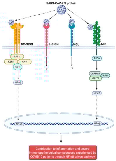 Expression of macrophages, monocytes, and DC has been associated with the pathogenic inflammatory response observed in COVID-19 patients. Expression of CLR receptors in healthy people and patients experience moderate and severe COVID-19 symptoms showed that patients with severe COVID-19 had elevated expression of DC-SIGN. Additionally, increased expression of key pro-inflammatory markers including, IL-1beta, IL-6, TNF-alpha, CCL2,CCL3, CXCL8, and CXCL10, was noted []. Neutralization assays were performed to investigate L-SIGN mediated SARS-CoV-2 entry. It was noted that soluble L-SIGN-fc neutralized viral entry by 48%. Furthermore, DC/L-SIGN overexpressed in HK-293 cells resulted in infectivity by SARS-CoV-2 promiting viral replication []. This potentiates a role for CLRs in the pathogenesis and cellular entry of SARS-CoV-2, as well as a role in inducing immunopatholoical side effects and aggumenting the inflammatory repsonse by cooperating with TLRs.