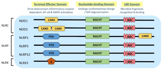 Major PRR families identified in mammals include Toll-like receptors (TLRs), nucleotide-binding leucine-rich repeat-containing proteins/nucleotide-binding oligomerization domain (NOD)-like receptors (NLRs), retinoic acid inducible gene I (RIG-I)-like receptors (RLRs), absent in melanoma 2 (AIM2)-like receptors (ALRs), C-type lectin receptors (CLRs), pyrin and intracellular DNA sensors. Unlike the well-known PPR family TLRs and CLRs, which are transmembrane receptors that sense extracellular and endosomal microbes, NLRs belong to another large PPR family that is present in the cytosols and is responsible for non-specific recognition of intracellular microbial products, including peptidoglycan, which is a molecular complex present in all bacteria cell walls [3]. Moreover, NLR also serves as the backup host defense system against invaded pathogens and in tissues where other PRRs are compartmentalized and acts jointly with other PRRs, especially TLR, to generate a substantial innate immune response [4].