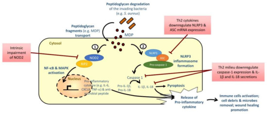 Th2-dominant milieu and impairment of NLR disrupt cutaneous defense against microbial pathogens in AD patients. S. aureus colonization is commonly observed in skin lesion of AD patients. Peptidoglycan fragments such as muramyl dipeptides (MDP) are constantly degraded from S. aureus, and are transported into the cells by bacterial secretion, endocytosis, membrane transport system or via outer membrane vesicles. MDP in the cytosol can then activate nuclear factor (NF)-kB and mitogen-activated protein kinase (MAPK) signaling, and trigger the release of downstream pro-inflammatory cytokines via (1) NOD2 recognition or (2) formation of NLRP3 inflammasome. NOD2, anti-microbial peptide and NLRP3 inflammasome components were found to be impaired or downregulated in basophils and keratinocytes of AD patients. Th2 cytokines also contribute to the suppression of its downstream caspase-1-dependent pro-inflammatory cytokine secretions. These abnormalities may explain their failure in microbial pathogen recognition, immune cell activation, wound healing and host defense.