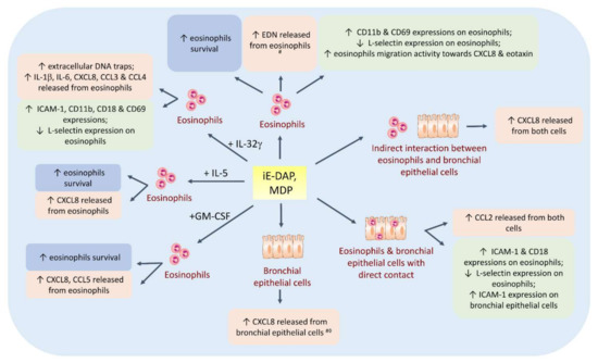 Effects of NLR ligands iE-DAP and MDP on human eosinophils, bronchial epithelial cells and their co-culture in vitro. NLR ligands promote eosinophil survival, downregulate L-selectin expression on eosinophils, but upregulate adhesion molecule ICAM-1 on eosinophils and bronchial epithelial cells with or without IL-32γ, IL-5 or GM-CSF treatment or in co-culture system; thus, they facilitate cell adhesion, chemotactic and migration of leucocytes. NLR ligands also induce the release of pro-inflammatory cytokines IL-1b, IL-6, CXCL8, CCL2, CCL3, CCL4 and CCL5 from eosinophils and bronchial epithelial cells to trigger inflammation in the lung. # The increase in eosinophil-derived neurotoxin (EDN) released from eosinophils/CXCL8 released from bronchial epithelial cells is observed upon MDP stimulation only. ◊ Results varied across publications.