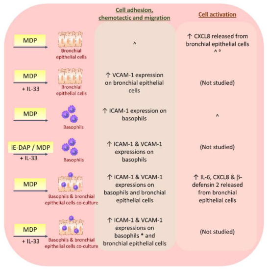Basophils are another type of leucocytes that produce Th2 cytokines in the late phase of allergy. NOD1 is not expressed in human basophils or basophil cell line KU812 cells. However, NOD2 is expressed in human basophils, KU812 and primary human bronchial epithelial cells [12]. NOD2 in basophils is also found to be involved in the bacterial defense and is potentially linked to the subsequent amplification of allergic airway inflammation (Figure 4). NOD2 ligand MDP can activate BEAS-2B cells and human basophils by stimulating their release of inflammatory cytokines, including Th17-polarizing IL-6, and upregulating the expression of intercellular adhesion molecule (ICAM)-1 and vascular cell adhesion molecule (VCAM)-1 in the co-culture of basophils and bronchial epithelial cells through NF-κB, c-Jun N-terminal kinases (JNK) and p38 MAPK pathways [12]; hence, magnifying the inflammatory response. ICAM-1 and VCAM-1 are essential for leucocytes migration to the inflammatory sites in allergy, with expressions that are positively correlated with allergic asthma severity [12,108]. MDP can also induce the release of anti-microbial peptide β-defensin 2 from the bronchial epithelial cells in the co-culture of human basophils and human bronchial epithelial cells [12]. Priming with Th2-promoting IL-33 can further enhance the stimulatory effect of MDP on human basophils [12,24], indicating that the Th2 cytokine environment, concomitantly, also promotes the MDP stimulation. The involvement of NLR in other immune effector cells recruited to the asthma pathogenesis requires further investigation.
