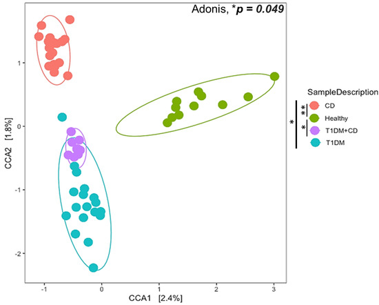 Ordination plot of Canonical Correlation Analysis (CCA) to explore between the sample diversity (Beta diversity). Samples from different groups: CD (orange), T1DM (blue), healthy control (green), T1DM+CD (purple) had a significant overall difference in composition (Adonis * p = 0.049). The difference observed was statistically significant between patients with CD or T1DM+CD compared to healthy controls (** p = 0.006 and * p = 0.03 respectively). Abbreviations: T1DM = Type 1 Diabetes; CD = Coeliac disease; CCA = Canonical Correlation Analysis.
