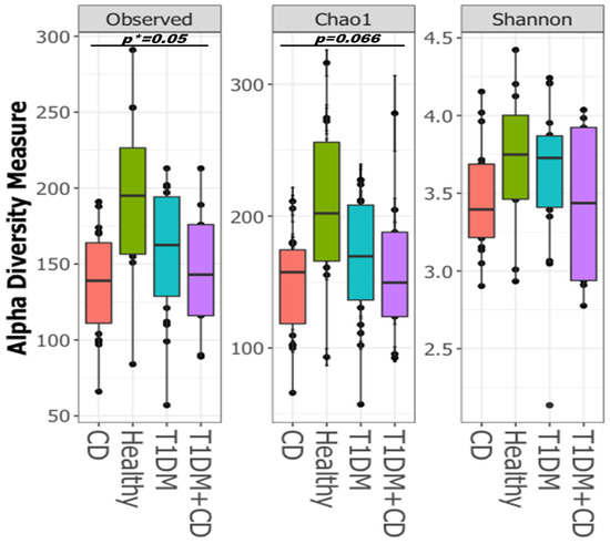 Healthy controls showed a greater alpha diversity based on observed OTUs (*p = 0.05) and marginally significant Chao1 indices (p = 0.066) (Figure 2). Patients with CD had markedly lower diversity, whereas those with T1DM had the highest diversity among the three disease groups (Figure 2). These results suggest that alterations in the gut bacterial microbiota diversity were aggravated in subjects with CD or with CD and T1DM.