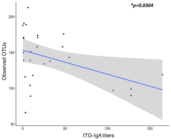 Linear regression was used to determine the correlation between the tTG titers (x-axis) and alpha diversity indices observed OTUs (y-axis). Abbreviations: OUT = Operational taxonomic units; Ttg-IgA = tissue transglutaminase IgA antibodies.